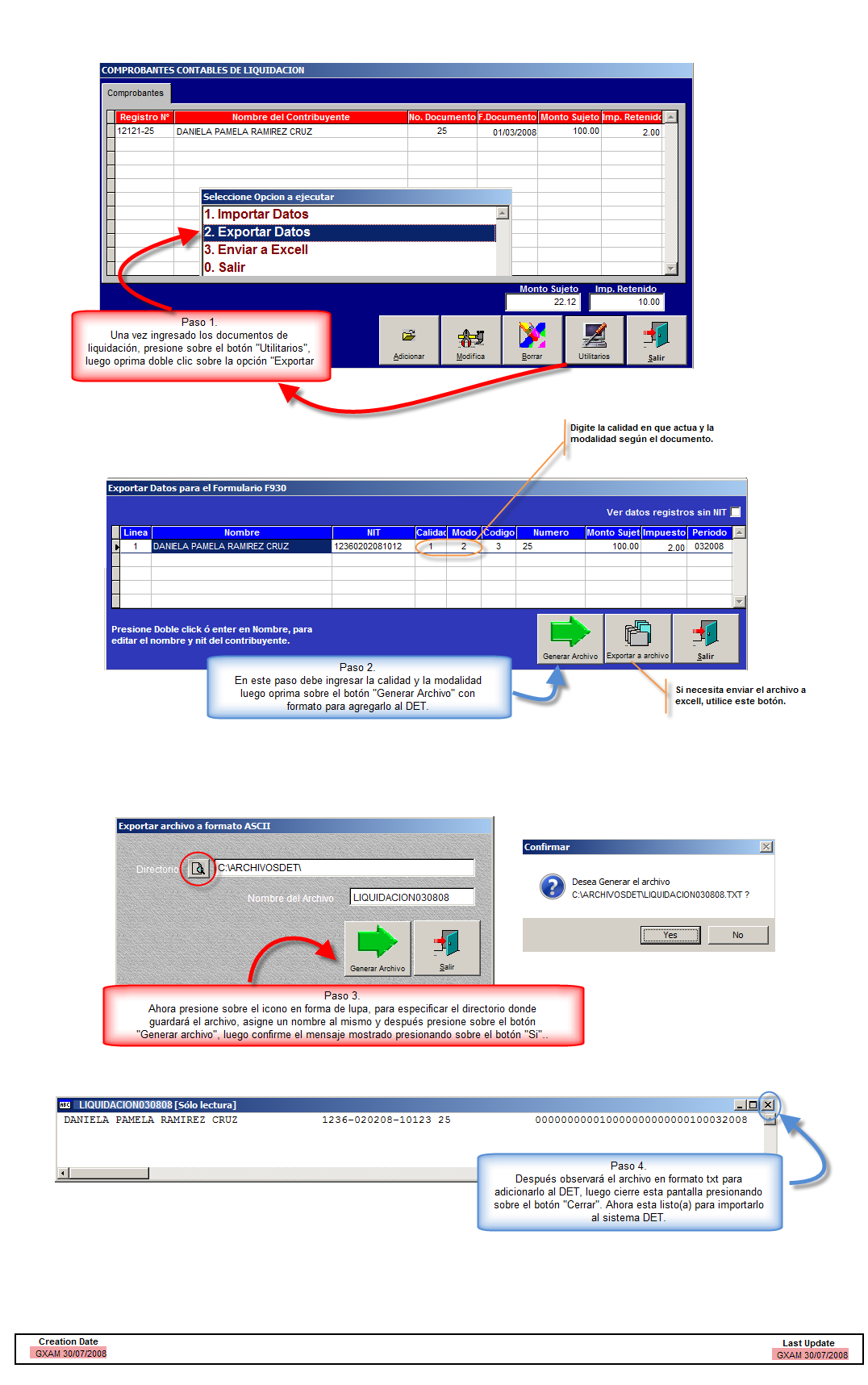 La pantalla que se muestra a continuación es especificamente sobre la generación de archivo de documentos de liquidación, recuerde que los mismos pasos puede aplicar para generar los de retención.