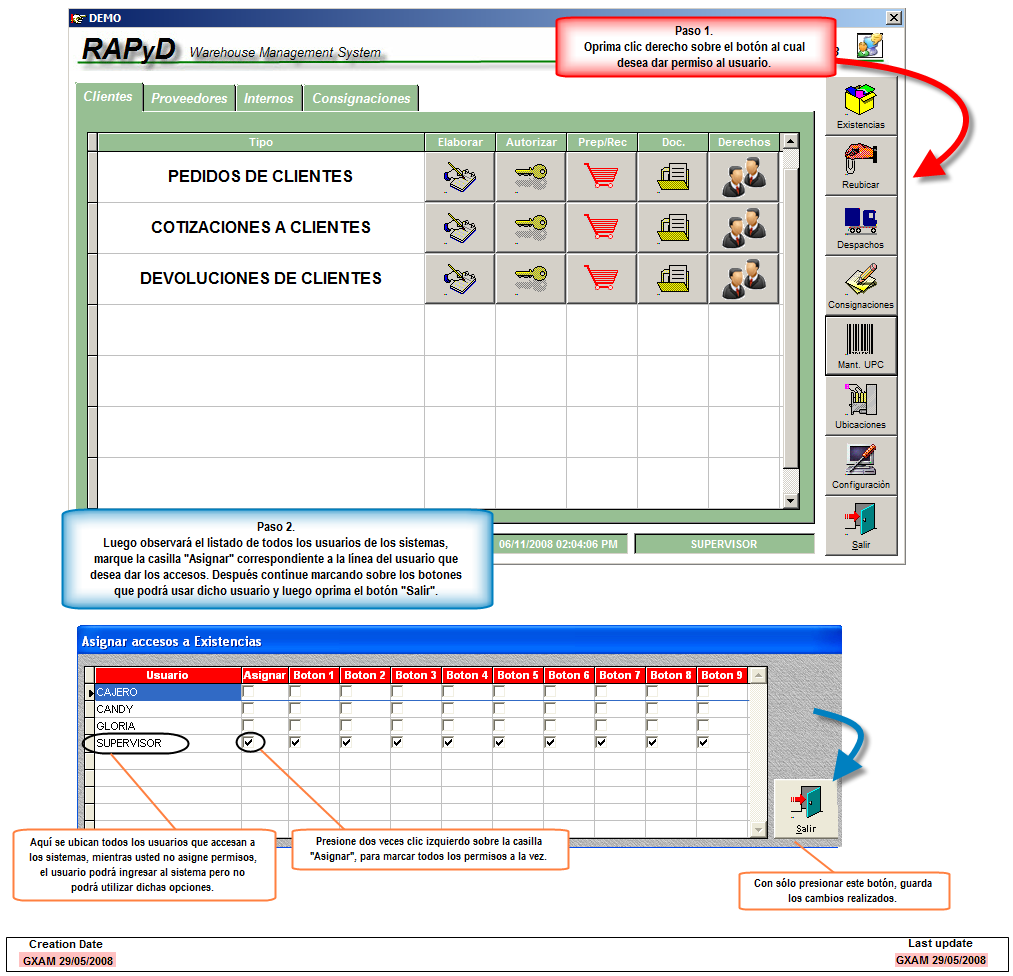 Estos permisos sólo los puede conceder el administrador del sistema o la persona que utiliza el usuario y clave del administrador esto validado así como forma de seguridad del manejo de los datos dentro del sistema, a continuación se detallan los pasos, veamos: