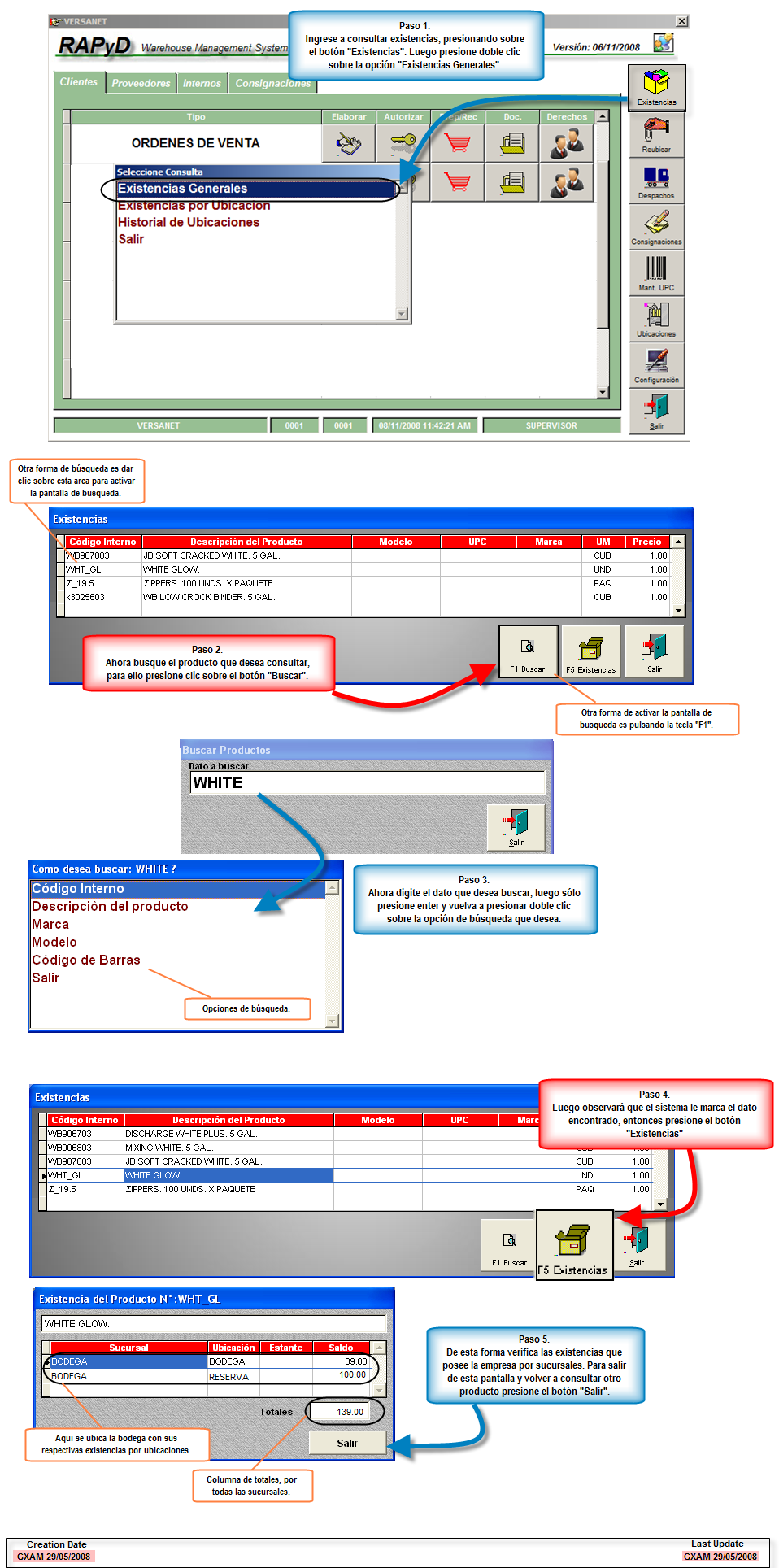 Al generar esta consulta obtiene el maestro de productos luego puede buscar un producto determinado haciendo uso de la tecla de función "F1", dispone de al menos cinco tipos de búsquedas dependiendo el dato a buscar así será el tipo de búsqueda utilizado. Luego utiliza la tecla "F5" para listar las existencias de la bodega por ubicaciones.
