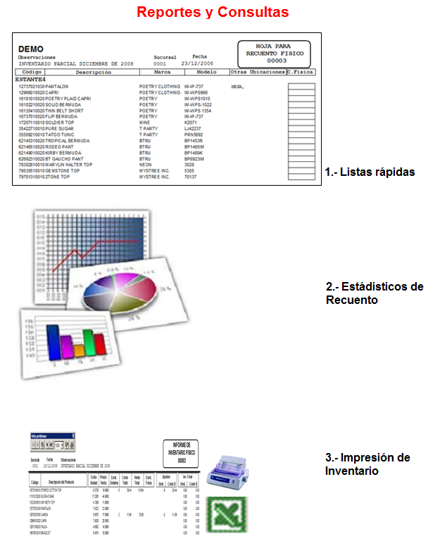 Topicos : Impresión de Listas Estadísticos de Recuento Impresión de reporte de Inventario Reporte de Inventario enviado a excell