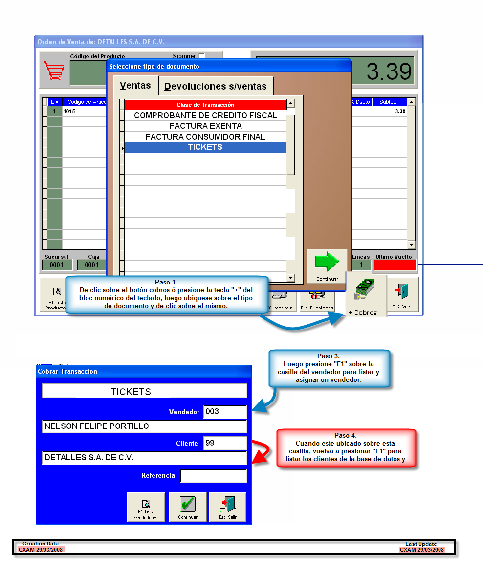 - Si elige Tickets ó Factura Consumidor Final, solo deberá digitar nombre del cliente para la impresión y el código de vendedor.