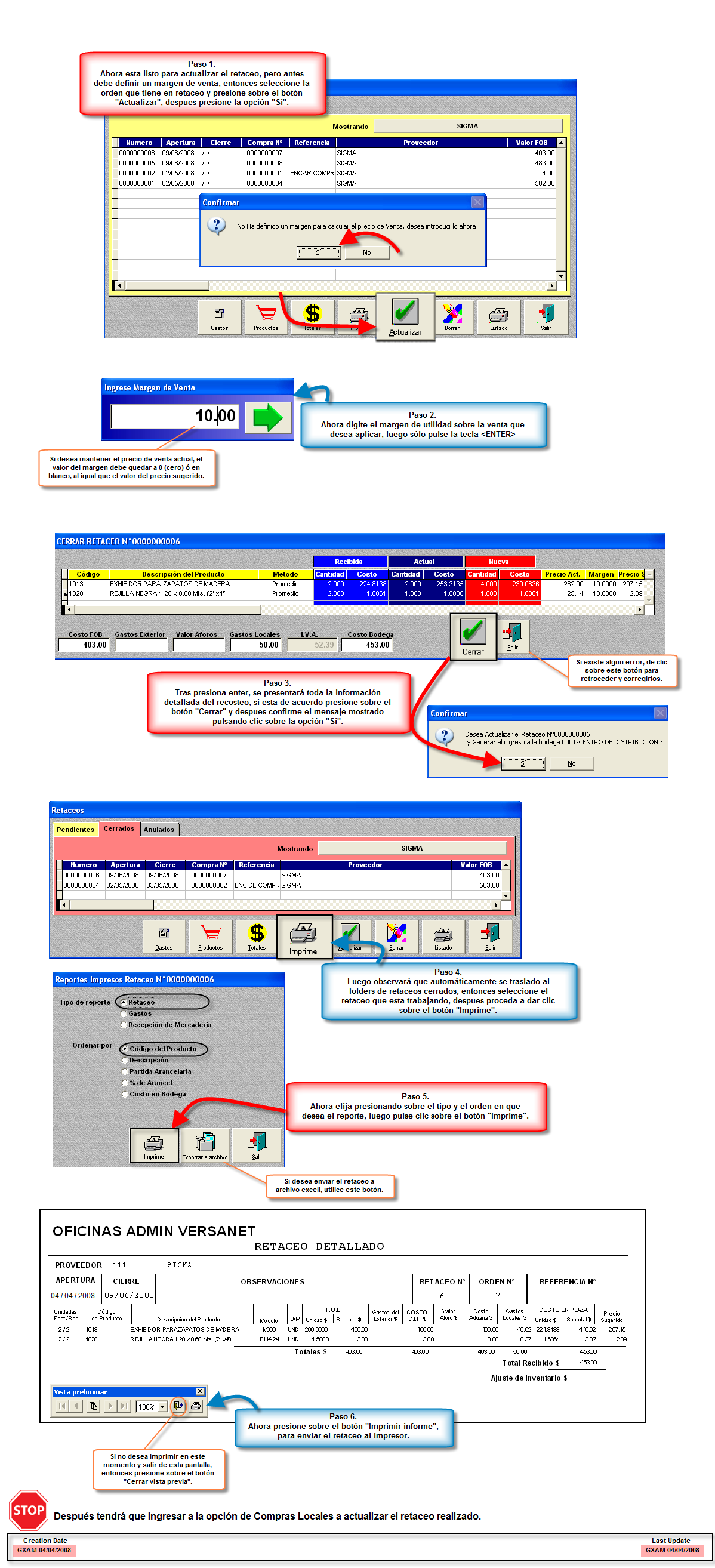 Mientras cierra el retaceo desde la opción RETACEOS, lo que hace es crear un folder en RECEPCION POR COMPRAS, que se ubicará con todos los datos antes detallados, indica entonces que debe actualizar dicho folder.