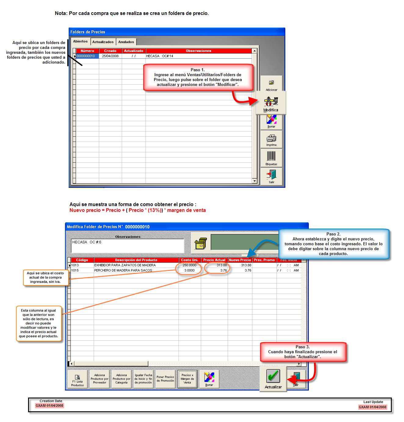 Cada vez que usted ingresa un compra, automáticamente se crea un folders donde debe fijar los precios de venta que tendrá la mercadería ingresada. Permitiéndole consultar el costo unitario y el precio de venta actual para establecer o no el nuevo precio.