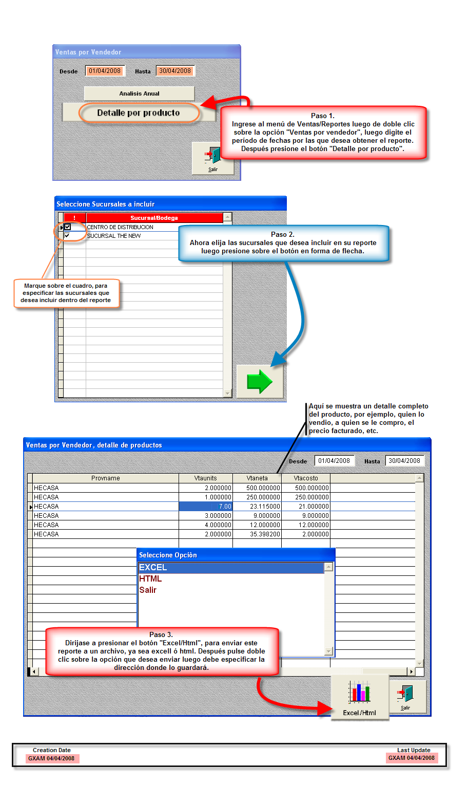 La opción de Detalle por Producto, le ofrece precisamente un detalle de todas las unidades vendidas, ventas netas y costos de venta por cada producto, vendedores y clientes.