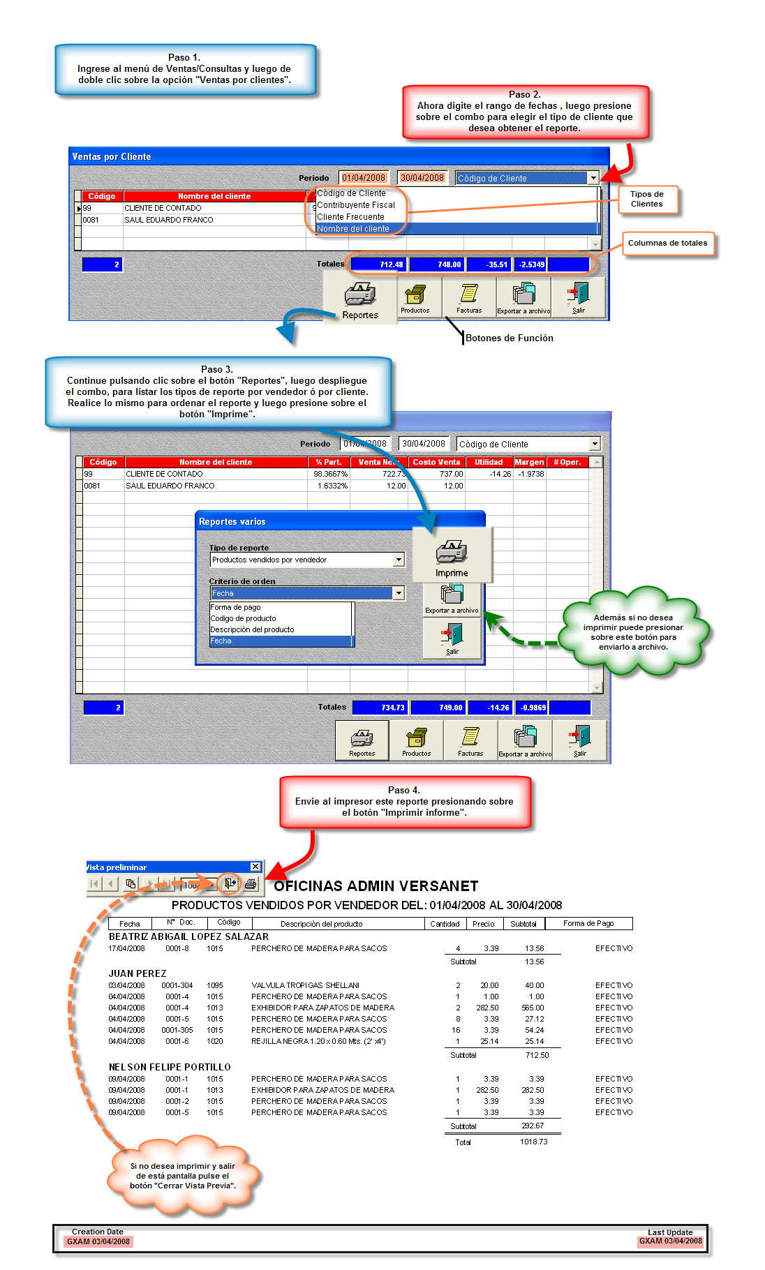 Si desea llevar un control de la frecuencia con la que los clientes compran mercadería a la empresa o los productos vendidos por clientes o por vendedor, haga uso entonces de la opción "Ventas por clientes", donde obtendrá una consulta de cada tipo de cliente con sus respectivos porcentajes de participación y la venta neta.