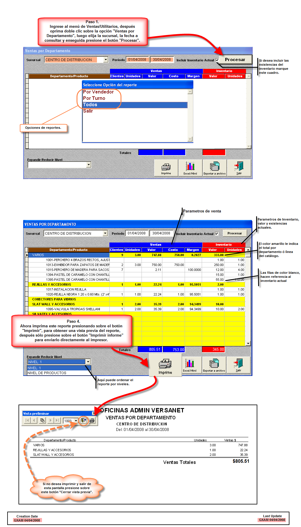 Desde la opción de "VENTAS POR DEPARTAMENTEO" puede obtener la ventas de acuerdo al catálogo de productos por cada una de las sucursales y en un rango de fecha determinado. Le permite también seleccionar o no incluir las existencias actuales del inventario. Reducir o expandirlo por niveles de acuerdo al catalogo de productos.