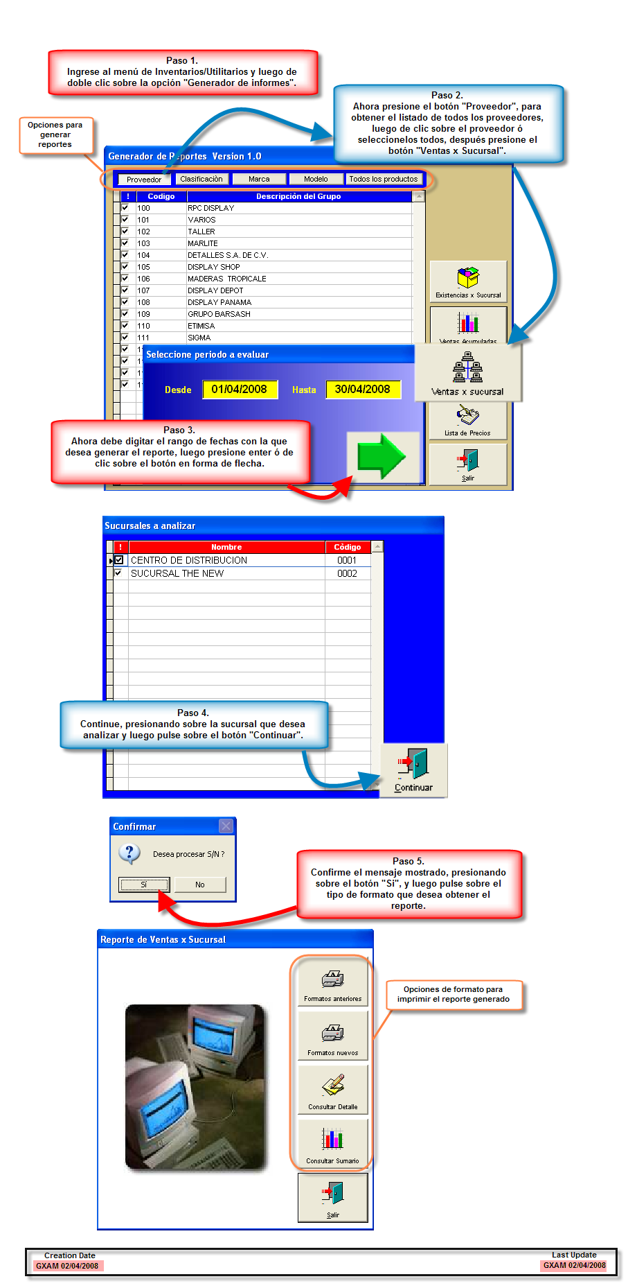 Dentro del sistema existe un "Generador de reportes", el cual le permite obtener diferentes tipos de reportes de ventas, existencias y precios del maestro de productos.