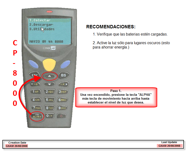 Se le ha presentado el caso que la pantalla es muy oscura y no se distinguen los códigos capturados, entonces no se preocupe si utiliza el COLECTOR DE DATOS CP- 8000 realice lo siguiente: