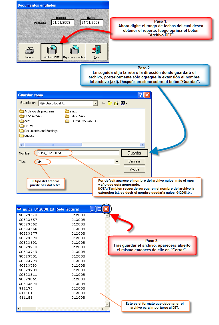 La función que utiliza es "Archivo DET", que es un formato según el sistema de Declaración Electrónica de Tributos (DET) para luego poder importarlo al mismo y obtener el detalle para la declaración de IVA por documentos anulados.