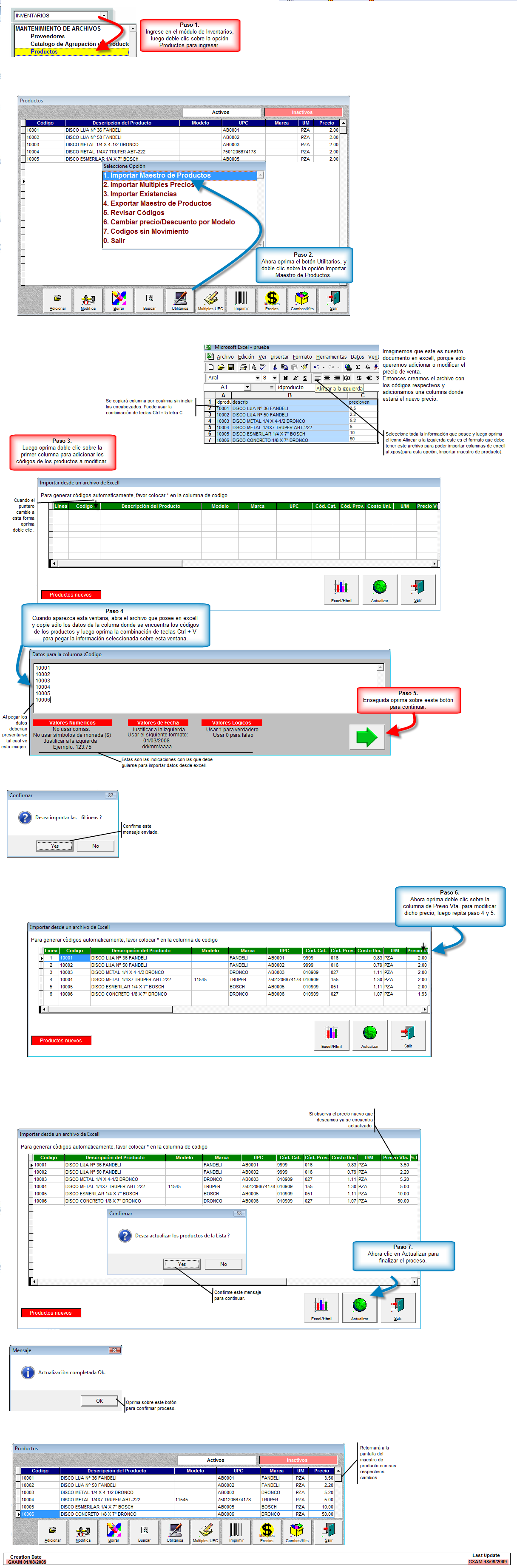 Desde la opción Importar maestro de productos, podrá importar productos nuevos o modificar códigos que ya existen, para ello sólo bastará crear un archivo en excell y dividir cada bloque en columnas, a continuación se explica como modificar precios de venta a productos que ya existen en el maestro de productos.