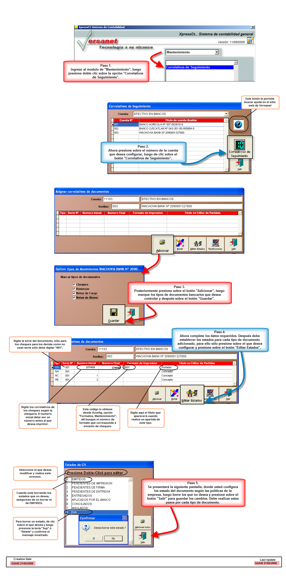 Utilice la opción Correlativos de Seguimiento, para asignar los correlativos de cada uno de los documentos bancarios a usar, como: remesas, notas de cargo, abono y cheques, para controlar la emisión de cada una de las cuentas de banco.
